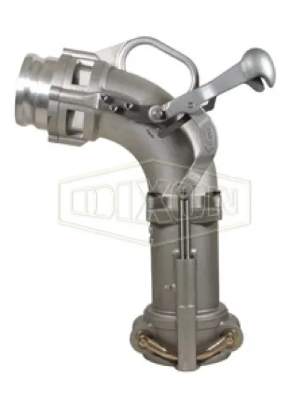 • Built in heavy duty, locking mechanism prevents accidental elbow disconnections while the elbow is in service. No need for the operator to engage the locking mechanism, just move the handle to the closed position and the lock automatically engages. Releasing the lock is equally as easy, just gripping the handle and lifting. The locking mechanism has lots of free clearance so will not be affected by dirt, ice or snow. (Elbow disconnections can occur on other elbow designs, from either operators bumping the release mechanism, or from a hydraulic surge when the underground storage tank overfill valve slams shut.