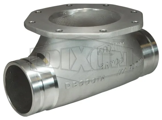 Straight tees are used at the base of dry bulk tank hoppers. With straight tees the dry bulk product is unloaded utilizing a blower generated pneumatic flow through the straight tee and air pressure on top of the hopper.